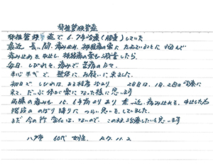 雑談をかわしながら施術を受ける。軽いシビレも消えた感じを受ける。おっしゃた通り、3回治療で90%改善された様だ。体はもちろんだが明るい気持ちになれたのは良かったです。