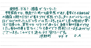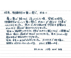 また、整体やマッサージの施術を取り入れるべきという医師からの勧めもありインターネット検索で満足度の高い評価を受けている当院に急ぎ連絡しました。急な連絡にも関わらず、当日より2回も施術して頂きました。